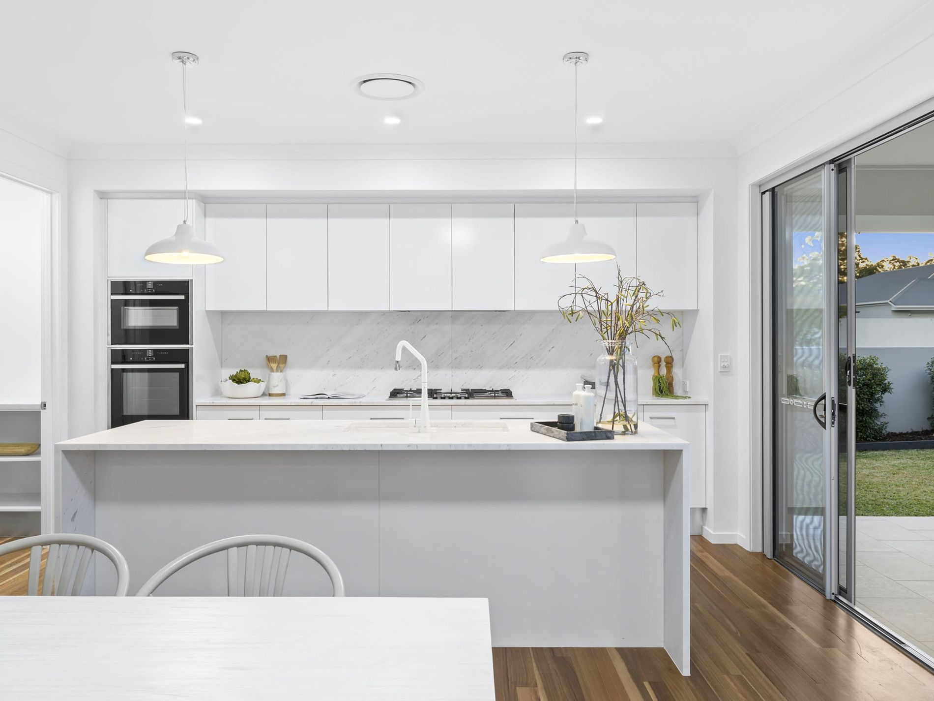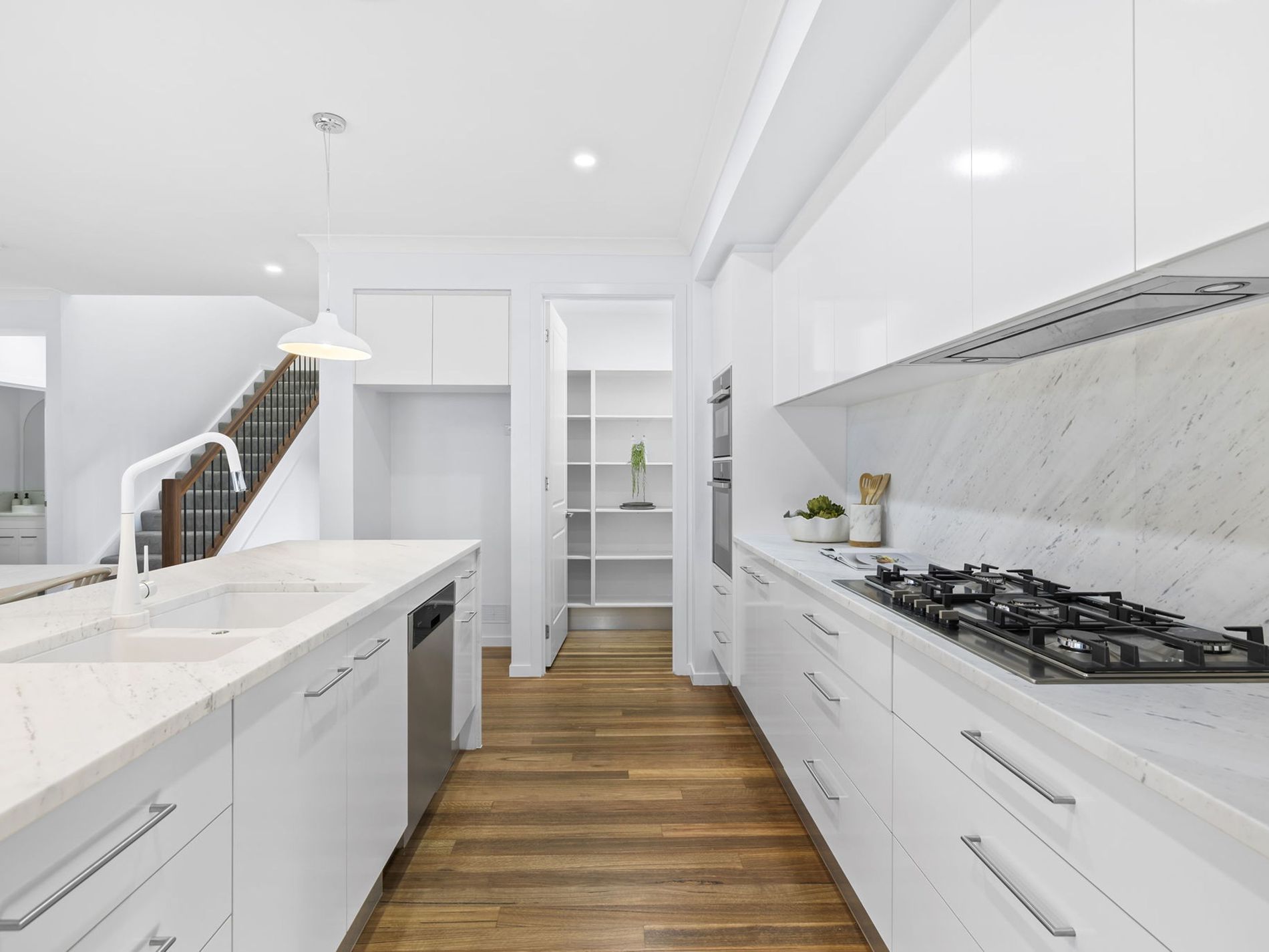 - The kitchen features Carrara marble bench tops with a large island, designer mixer & sink