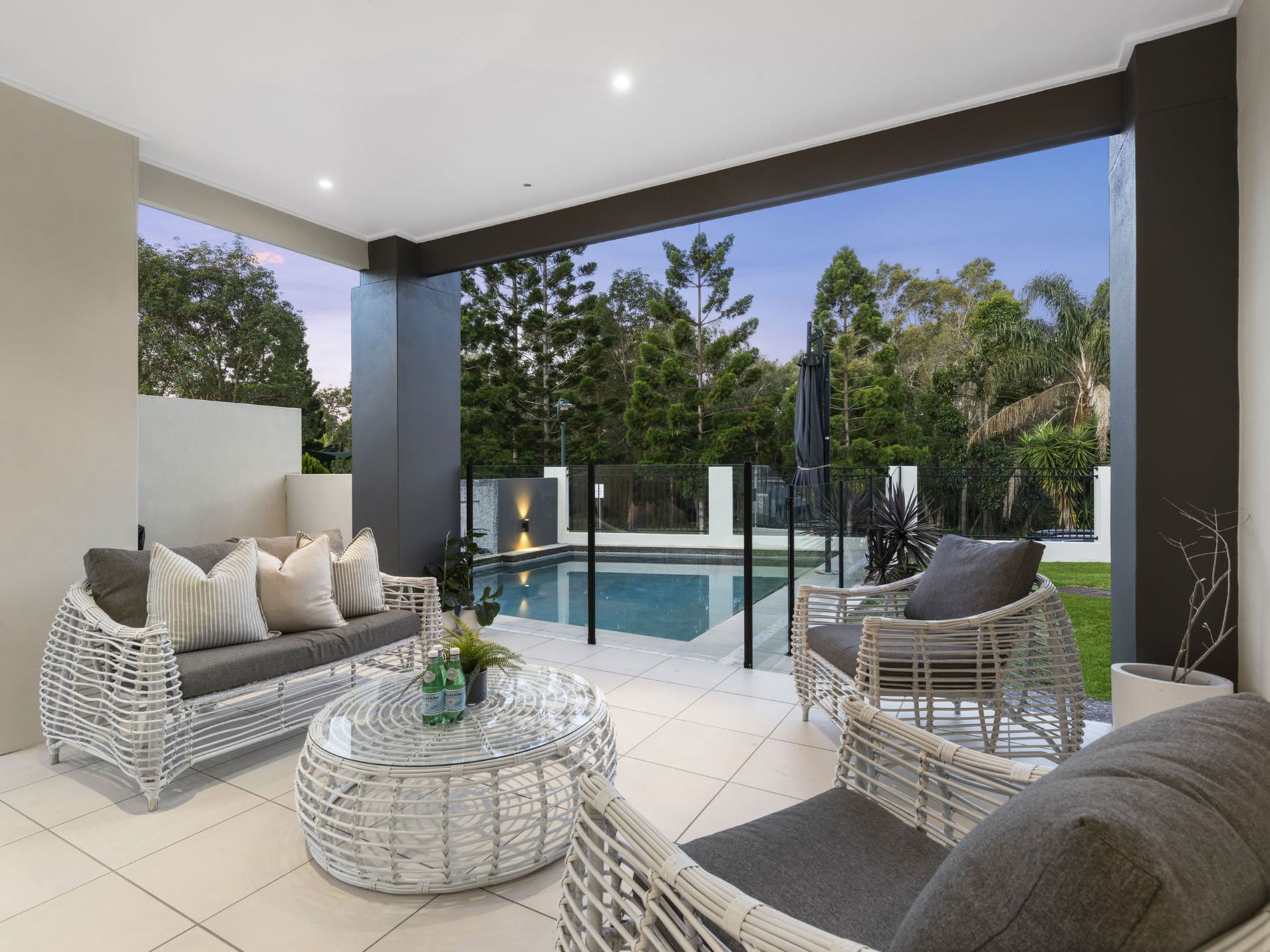 - The entertaining area overlooks the pool and yard for the kids