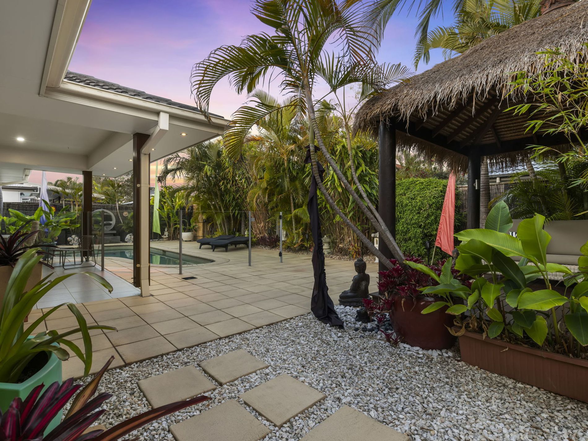 Outside is where this property truly shines. A sparkling swimming pool framed by lush greenery sets the tone for relaxed resort-style living, while the tropical pergola with thatched roof offers a shady retreat for lounging, reading, or enjoying a quiet morning coffee. Come home to low maintenance living and privacy, this home offers the tranquillity and a quiet lifestyle you can retreat to every day.